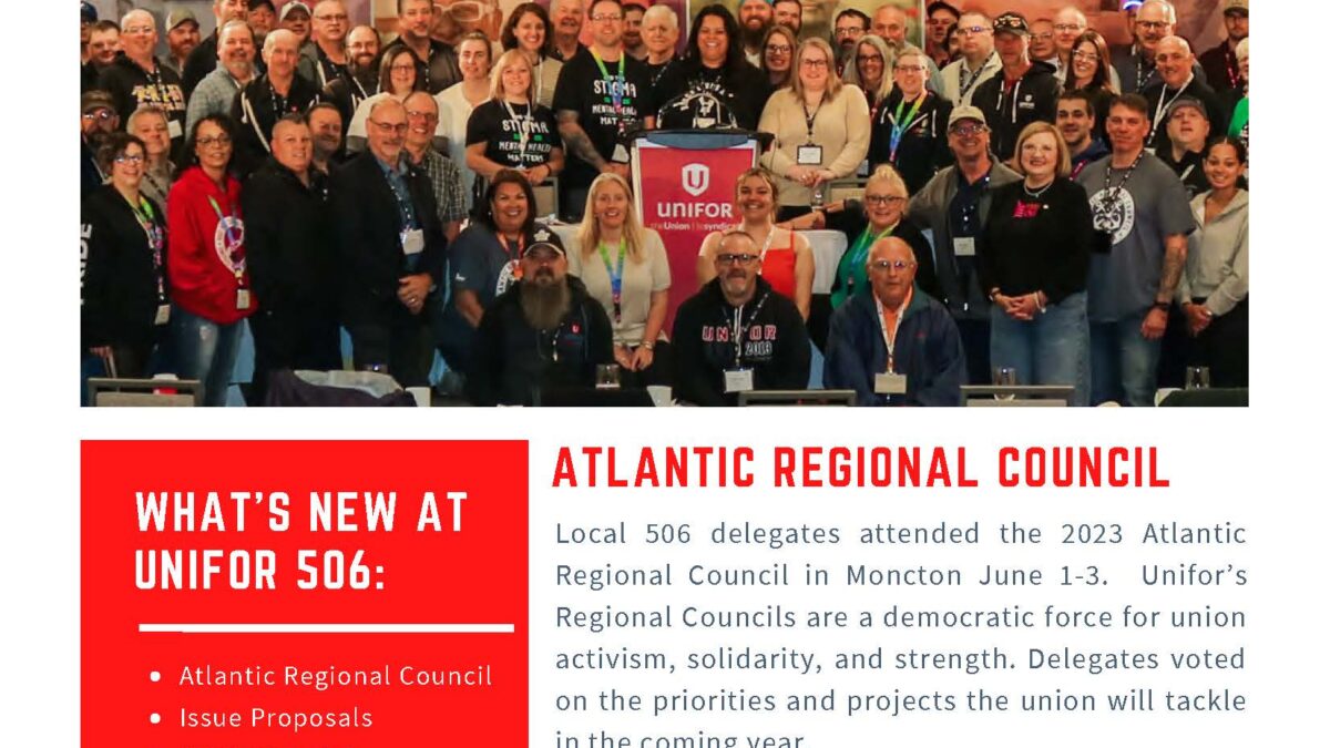 Local 506 delegates attend the 2023 Atlantic Regional Council in Moncton June 1-3. Unifor’s Regional Councils are a democratic force for union activism, solidarity, and strength. Delegates voted on the priorities and projects the union will tackle in the coming year.